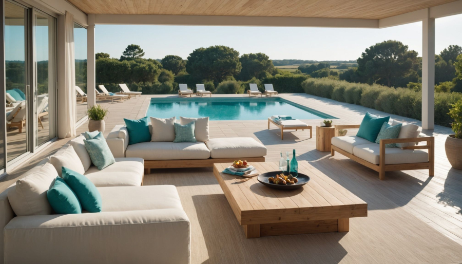 - Terrasse couverte : mobilier de jardin haut de gamme, stores électriques